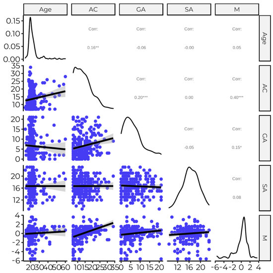 Corrplot for continuous variables. Above the main diagonal of the matrix, the correlation coefficient values and their significance was presented; at the main diagonal one dimensional density estimation of subsequent variables, and under the main diagonal two-dimensional scatterplots. Note AC—anxiety of COVID-19, GA—generalized anxiety, SA—the need for social acceptance, M—compliance to the rule of face and nose covering (indoors). Significance levels: * p < 0.050; ** p < 0.010; *** p < 0.001.