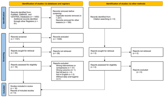 - Alhazzani, W.; Smith, O.; Muscedere, J.; Medd, J.; Cook, D. Toothbrushing for critically ill mechanically ventilated patients: A systematic review and meta-analysis of randomized trials evaluating ventilator-associated pneumonia. Crit. Care Med. 2013, 41, 646–655. [Google Scholar] [CrossRef]
