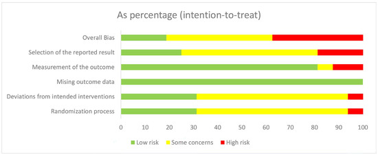 The risk of bias assessed for the RCTs is summarized in Figure 2 and Figure 3. Six studies [24,32,34,36,37,38] included a high risk of bias and seven studies [2,4,25,26,33,35,39] included some concerns of a risk of bias. Three trials [34,36,38] introduced a high risk of bias in the selection of the reported result for multiple eligible outcome measurements within the outcome domain, two [24,38] in the measurement of the outcome for missing binding information, one [37] in the randomization process for the failure of allocating a sequence random, and one [32] in deviations from the intended interventions for the failure of blinding the participants and personnel.