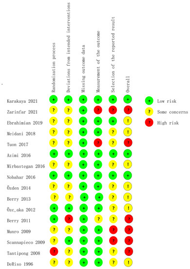 - Sterne, J.A.C.; Savovic, J.; Page, M.J.; Elbers, R.G.; Blencowe, N.S.; Boutron, I.; Cates, C.J.; Cheng, H.Y.; Corbett, M.S.; Eldridge, S.M.; et al. RoB 2: A revised tool for assessing risk of bias in randomised trials. BMJ 2019, 366, l4898. [Google Scholar] [CrossRef]