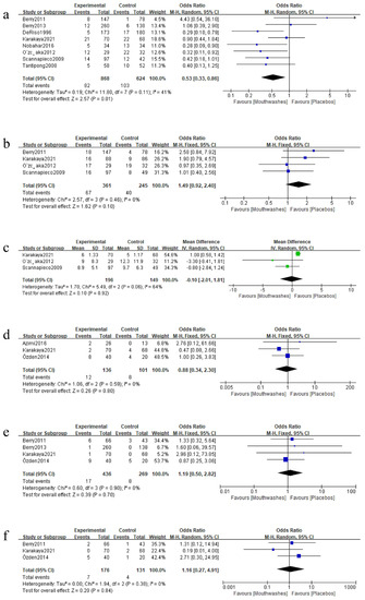 3.4.1. Meta-Analyses Comparing the Effect of Mouthwashes on VAP Incidence to Placebos