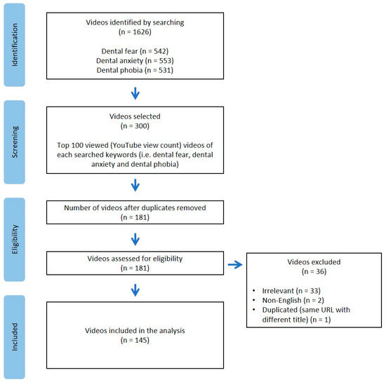 A search of YouTube videos was conducted on 25 October 2022. The search string in this study was adapted from a qualitative study of YouTube videos related to dental fear and anxiety in children and adolescents conducted by Gao et al. (2013) [23]. Qualitative analysis has often been used in dental research [24]. The terms dental fear, dental anxiety, and dental phobia were searched on the YouTube home page. The first 100 most widely viewed videos that resulted from each search term were recorded and screened. Hence, a total of 300 videos were correspondingly screened for eligibility. Videos with a title or content covering information related to dental fear, dental anxiety, or dental phobia were included. Exclusion criteria included irrelevant (e.g., cartoon, game, and role play video with no information or unrelated to dental fear and anxiety; purely for entertainment; and purely music with/without narrative for meditation or hypnosis purposes) and non-English videos.