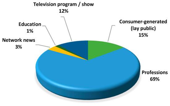 Among the included videos, most were created by health professions (n = 100; 69%) such as a dentist, dental hygienist, psychologist, etc. The second most common video source was from the lay public (n = 21; 15%). The rest were generated from television programs (n = 17; 12%), network news channels (n = 5; 3%), and the education sector (n = 2; 1%) (Figure 3).