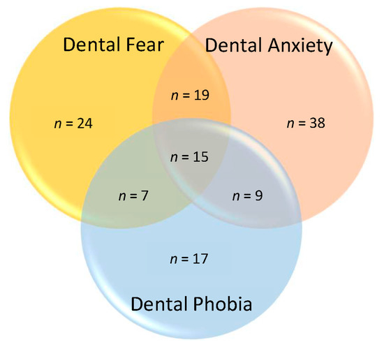 - Bürklein, S.; Brodowski, C.; Fliegel, E.; Jöhren, H.P.; Enkling, N. Recognizing and differentiating dental anxiety from dental phobia in adults: A systematic review based on the German guideline” Dental anxiety in adults”. Quintessence Int. 2021, 52, 360–373. [Google Scholar]