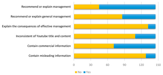 Overall features of the videos are shown in Figure 7. Of the 145 included videos, suggestions for managing dental fear, dental anxiety, or dental phobia with pharmacological or non-pharmacological interventions were found in 100 videos (69.0%), while 59 videos (40.7%) provided general strategies for tackling patients’ fear. However, only few videos (n = 13; 9.0%) explained and discussed the consequences of effective management of dental fear and anxiety. Moreover, inconsistencies between the video title and content were found in 36 videos (24.8%). Furthermore, more than half of the videos (n = 74; 51.0%) contained commercial information (i.e., address, e-mail address, telephone, and fax number of a dental clinic), and 17 videos (11.7%) contained misleading information. The Cohen’s kappa of whether the included videos contained misleading information was 93%.