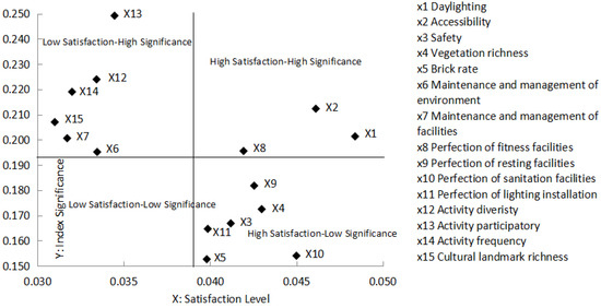Next, we address the degree of influence of indexes on public space satisfaction as the significance of indexes (Y axis) and levels of public space satisfaction on the X axis. We analyzed the correlation between levels of satisfaction (X axis) and significance (Y axis) to deduce four quadrants according to the value average of significance and satisfaction levels (Figure 1).