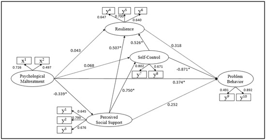 The direct effect of psychological maltreatment on perceived social support was (β = −0.339, p = 0.047) significant. The direct effect of perceived social support on resilience (β = 0.507, p = 0.023) and the direct effect of self-control on resilience (β = 0.526, p = 0.004) were significant. The direct effect of psychological maltreatment on self-control was not statistically significant, but its indirect effect (β = −0.254, p = 0.037) was significant. The direct effect of perceived social support on self-control was (β = 0.750, p = 0.003) significant. The total effect of psychological maltreatment on problem behaviors (β = 0.379, p = 0.024) and that of self-control on problem behaviors (β = −0.703, p = 0.043) were significant. However, the direct effect, indirect effect, and total effect of perceived social support and resilience on problem behaviors were all not significant (Table 7).