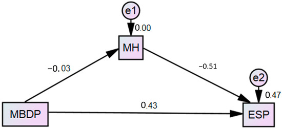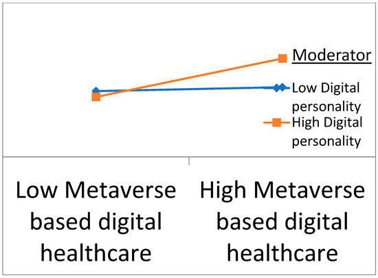 The study hypothesized a significant positive relationship between metaverse-based digital health and eSport performance among Chinese athletes. Table 7 dictates that the linear relationship was significant and positive. A unit change in the metaverse-based digital health would enhance the eSport performance of Chinese athletes by 16.5% (p < 0.05). The mediation of mental health between metaverse-based digital health and eSport performance was also significant as the p-value, for this formulated hypothesis lies at 0.000. Figure 3 supports the SEM result audacity. The moderation of digital personality between metaverse-based digital health and mental health was also significant, as illustrated in Figure 4 below.