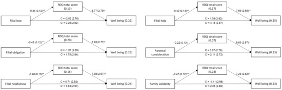 The Mediating Role of RDQ in the Relationship between Filial Maturity and Well-Being. Note. Values on the arrows are B (SE); values within the rectangles are R2, C = total effect, C’ = direct effect. * p < 0.05, ** p < 0.01, *** p < 0.001.