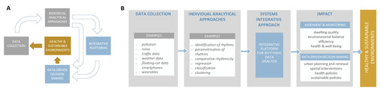 Computational framework for integrative analyses of rhythmic data. (A) The establishment of the proposed computational framework shall enable data-driven decision making guided beyond a single domain. (B) The application of the proposed computational framework would allow the implementation of comprehensive data-driven decision making in fostering sustainable and healthy urban environments.