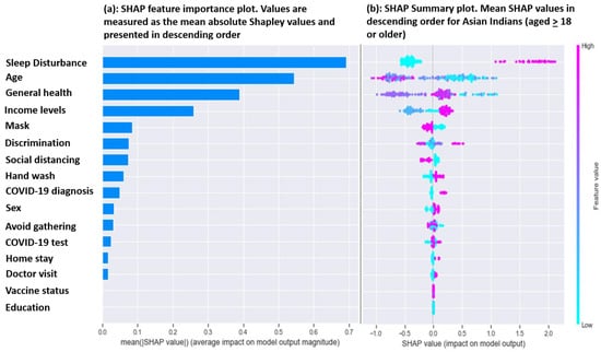 Feature importance: We present the key predictors of poor mental health among Asian Indians in Figure 2a using a feature importance plot derived from SHAP values. The higher SHAP value in Figure 2a represents a more important contribution to the poor mental health model. In our study, the top five leading predictors were (1) sleep disturbance, (2) age, (3) general health, (4) income levels and (5) mask.