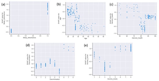 Shapley additive explanation (SHAP) dependence plots of key features in the poor mental health model among Asian Indians aged 18 years and older. Note: Each point on the plot corresponds to a prediction made for an Asian Indian. The SHAP dependence plot shows the main effects of features on poor mental health by (a) sleep disturbance, (b) age, (c) general health (d) discrimination and (e) income levels.