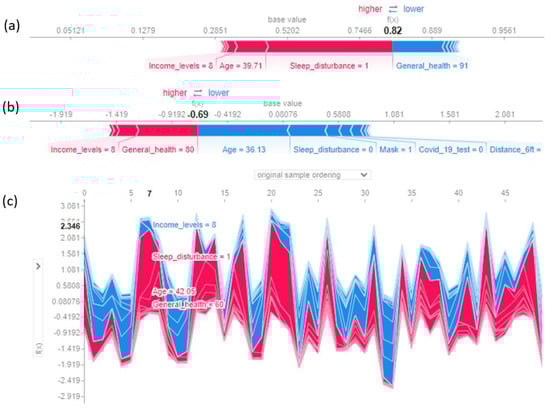 Shapley force plots of individual and collective observations. (a,b): Features in red influence the model towards poor mental health, and features in blue influence the model away from poor mental health. The size of the features represents their importance (for example, the most important feature in (a) was sleep disturbance). Features close to the red and blue color separation marks have a greater impact on the model. (c) represents the collective force plot of 50 individuals. In the collective force plot, the Y-axis is the X-axis of the individual force plot.