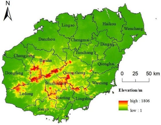 Hainan Province, consisting of the Hainan, Nansha, Zhongsha, and Xisha islands, is located at the southernmost tip of China and is separated from Guangdong Province by the Qiongzhou Strait in the north. The total land area of the province is 35,400 square kilometers, of which Hainan Island is about 33,900 square kilometers. It is known as the second largest island in China after Taiwan. The terrain of Hainan Island is low and flat around, and high in the middle. It has a tropical monsoon climate with abundant precipitation, a year-round stable forest cover of over 60%, a wide variety of plants, and one of the highest quality ecological environments in China. Due to the combination of natural and transportation conditions and historical development, its main population and socio-economic activities are mostly distributed in the eastern coastal areas, Haikou City in the north, and Sanya City in the south. As Sansha City functions as the center of national defense, this article delineates the study area to be 18 cities and counties in Hainan Island (Figure 1).