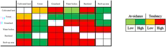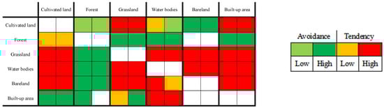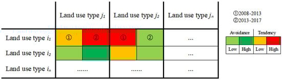 This study borrowed ideas from the cross-linked table of two land conversion patterns of area increase and decrease pioneered by Wang et al. []. As shown in Figure 2, each horizontal row of ① and ②, respectively, represents the two time intervals for 2008–2013 and 2013–2017, and the color represents whether the land use type j tends to or avoids conversion to land use type i. The light green, indicating that the conversion of land use type j to land use type i shows low avoidance in the corresponding time interval, while dark green indicates high avoidance. Similarly, yellow and red, respectively, represent a low or high tendency of land use type j to be transformed into land use type i. The colorless part has two meanings: one is that its corresponding land use types i and j are the same, that is, this part of the land has not undergone land use type transformation. The other is that its corresponding land use types i and j are not the same, but the area converted from land use types j to i is 0 in the corresponding time interval.