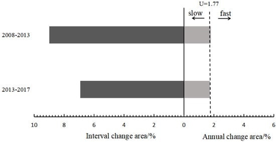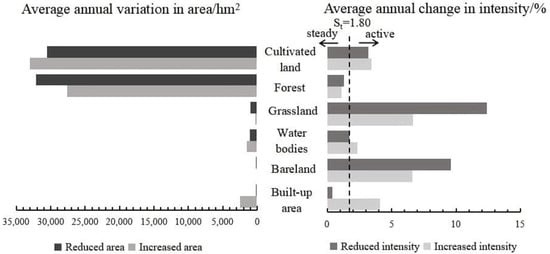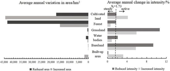 In this study, the increase in cultivated land and the decrease in forest land were the highest area changes, while the smallest area change was seen in bare land, which was almost negligible (left half in Figure 5 and Figure 6). The difference between the transfer in and out of cultivated land and forest from 2008–2013 was not significant; however, the decrease in cultivated land and the increase in forest land during 2013–2017 slowed rapidly, resulting in a significant increase in the area of cultivated land and a decrease in the area of forest. The change intensity in both the increase and decrease of cultivated land, grassland, and bare land during the study period was consistently greater than the average change intensity, indicating that they were all more active. In contrast, the increase and decrease in the change intensity of forest land during the same period were lower than the average, with the amount of forest remaining relatively stable. Although the average annual increase and decrease in area of forest land were the highest, the intensity of change was not significant due to its large base figure. In addition, the increase in intensity of the built-up area was higher than the average intensity, however, the decrease in intensity was much smaller than average, reflecting its relatively active state.