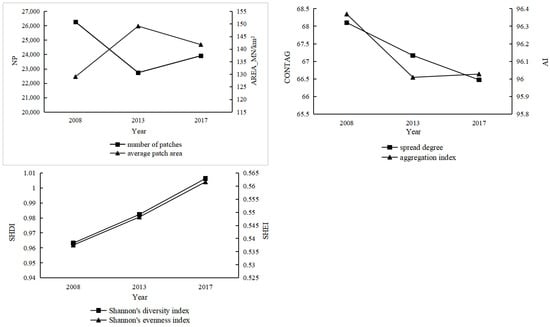 As can be seen from Figure 9, trends in the number of patches and the mean patch area of Hainan Island reversed during the study period, with the former showing a decline followed by a rise and the latter a rise followed by a decline. Both the spread degree and aggregation index characterize the aggregation status of different landscape types. These showed a decreasing trend overall, indicating that the aggregation of landscape patches in Hainan Island continued to weaken and the fragmentation degree increased. The trends of the Shannon diversity index and Shannon evenness index were more or less the same, both showing a continuous increase, indicating that the landscape diversity in the study area increased, and that the distribution of each landscape type tended to be balanced.