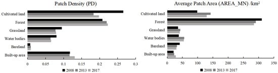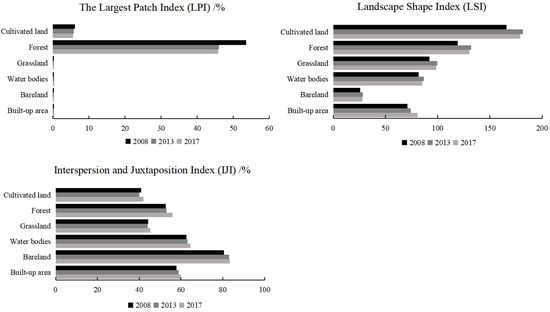 By analyzing the landscape indices of different land use patch types (Figure 10), it was seen that the patch density of forest was gradually increasing, while its mean patch area was gradually decreasing; this showed that the patch fragmentation degree of the forest landscape was continuously aggravating. Meanwhile, the largest patch index showed that the forest landscape was dominant in the study area, although its position was gradually declining. This might be due to the fact that, since the construction of the international tourism island, major projects have been launched, resulting in the dramatic increase of demand for land. Thus, the intensity of human exploitation activities on forest land saw a notable increase, with many large patches divided into smaller ones, leading to an increase in the fragmentation degree of forest patches. The landscape shape index of cultivated land was significantly higher than that of other land use types and showed an increasing trend overall, which indicated that the patch shape of cultivated land was becoming more complex. From 2008 to 2017, the interspersion and juxtaposition indices of each landscape type showed an increasing trend, indicating that the richness of each neighboring landscape type increased.