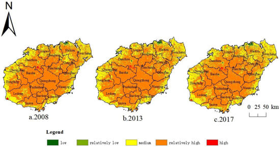 In this paper, a 30 m × 30 m raster was used as the basic research unit to explore the spatial variation pattern of ESV on Hainan Island, and we used the Natural Jecks method to classify the ESV into 5 grades: low, relatively low, medium, relatively high, and high in ArcGIS 10.8 software, according to the three periods of ESV on Hainan Island. Finally, we got the spatial distribution of ESV grades on Hainan Island for 2008, 2013, and 2017 (Figure 11).