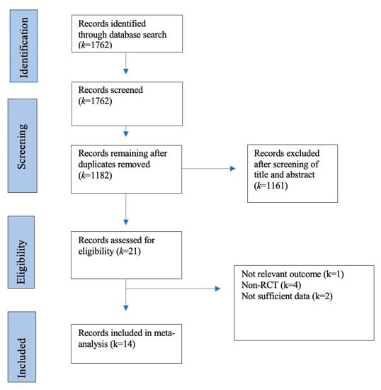 Through the literature search and the supplement search, a total of 1762 articles were identified. After manual removal of duplicates, a total of 1182 articles were reviewed. Based on title and abstract, 1161 articles were excluded with an inter-rater agreement of 98.4%. The remaining 21 articles were thoroughly reviewed in full text. Seven of them did not meet the inclusion criteria and were thus excluded. A flow chart of the literature search can be seen in Figure 1. A total of 14 articles met all inclusion criteria and were included in the meta-analysis.