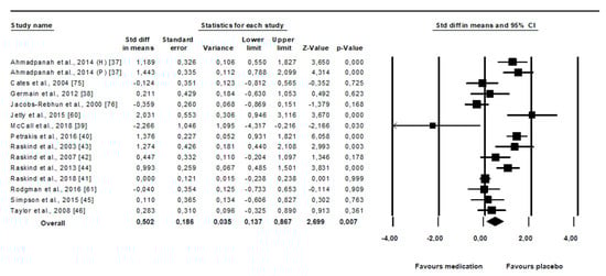 The results of the 15 pharmacological interventions after treatment (14 studies, N = 830) showed an overall effect size of g = 0.50 (95% CI = 0.14–0.87, p = 0.007). See Figure 2. It should be noted that there was large variation in the effect sizes between the different studies manifested by a Cochran’s Q of 83.1 (df = 14, p < 0.01), which indicates significant heterogeneity. The I2 suggested that 83.2% of the variation in effect sizes reflects real variation. Following the Knapp–Hartung adjustment [72], the 95% CI interval became wider (0.06–0.95, p = 0.029), but the overall effect size was still significant. When only including studies with low risk of bias (k = 5), the overall effect size became non-significant (g = 0.11, 95% CI = −0.44–0.67, p = 0.690).