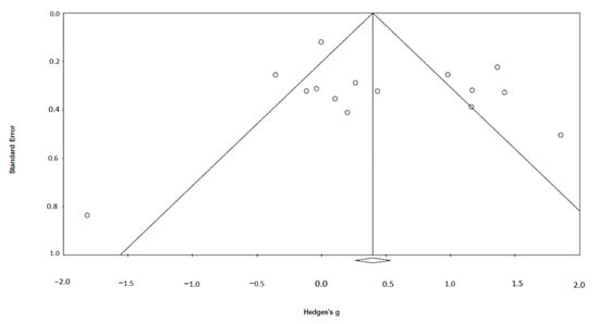 Funnel plot showing distribution of Hedges’ g in relation to standard error.