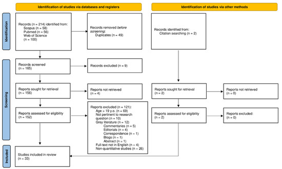 The initial search identified a total of 214 publications. After collecting the records and removing the duplicates, we applied the eligibility criteria. A total of 165 records were screened by SM and CS, assessing titles and abstracts according to the inclusion criteria. Disagreements between the first three authors were settled through the involvement of two other authors, namely, FM and MM. In total, 9 records were excluded in the screening process, which resulted in the retrieval of 156 records. The full-text of these records were obtained and reviewed by SM and FM, and any discrepancy over eligibility determination was resolved through involvement of MM and MI. Among the 156 full-text articles sought for retrieval, 4 full-texts were unavailable, resulting in 152 full-texts assessed for eligibility. Of these, 121 records did not meet the inclusion criteria, and were thus excluded from the systematic search. Specifically, 69 records were excluded due to the presence of a sample that did not match the age constraints (<18 years of age), 10 were not pertinent to the research question, 4 full-texts were not in English, 26 were non-quantitative studies, and 12 involved grey literature. Of the latter, five were commentaries, four were editorials, one was a correspondence, one a blog, and one an abstract. Given that all databases used for our search allowed for the emergence of records containing the search terms in the title, abstract, and keywords, according to the PRISMA guidelines, in-text citations of the selected articles were then further inspected to identify additional records. As a result, in-text relevant citations, if peer-reviewed and indexed, were also considered. The systematic search eventually led to the inclusion of 33 articles. The details of this procedure are illustrated in Figure 1.