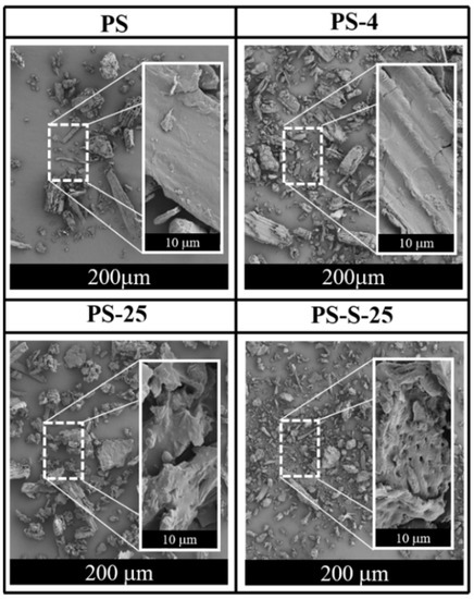 SEM images of PS, PS-4, PS-25, and PS-S-25.