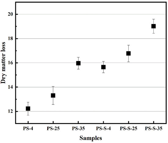 As shown in Figure 2, the dry matter loss of PS-4, PS-25, PS-35, PS-S-4, PS-S-25, and PS-S-35 were 12.22%, 13.31%, 15.97%, 15.65%, 16.77%, and 19.02%, respectively. Increasing storage temperature led to the higher dry matter losses. PS-S-35 was decomposed more than PS, PS-4, PS-25, PS-35, PS-S-4, and PS-S-25. The additive of soil enhanced the dry matter loss of samples. All biomass breaks down over time through the same microbial processes. Anoxic degradation leads to increased gas emissions (CH4 and N2O), resulting in increased dry matter loss. Moreover, the storage temperature may accelerate the decomposition rate. Meanwhile, the dry matter loss was increased at the faster decomposition rate [15]. Initially, the temperature was increased in the pile as the respiration, which promotes the rate of microbial degradation. Leading to the dry matter loss was increase. With the addition of soil, the microbial community became richer, resulting in the increment of dry matter loss of stored PS. The dry matter loss under anoxic storage was decreased, which the biomass feedstock was left greater than that of unstored biomass feedstock. Therefore, the cost of biomass feedstock under anoxic storage was lower than that of unstored feedstock and aerobic storage.