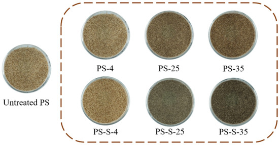 In Figure 3, the brown color was intensified as the storage temperature increasing, and with the addition of soil, the color of the stored PS was dark brown or black. The brightness (L*) of the PS after anoxic storage was all lower than that of the untreated PS. The total color variation () was higher than 3 with the decrease from 62.91 to 41.22, which was visible to the naked eye, due to the increase in volatile content, the decrease in hemicellulose content and the degradation of biomass [25].