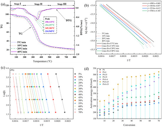 Figure 4c shows the FWO models of PS, PS-4, PS-25, PS-35, PS-S-4, PS-S-25, and PS-S-35, and Figure 4d shows the apparent activation energy (Ea) of pine at different conversion rates (α) under the FWO model. In PS, Ea started to be low at the conversion rate of 0.05, which was 199 kJ/mol, and rose to 260 kJ/mol at the conversion rate of 0.50, which increased slowly during this period. When α was greater than 0.50, Ea increased greatly, and reached 335 kJ/mol with α as 0.70. It can be concluded that the Ea of PS increased with the increase in conversion α, which may be related to the thermal stability of hemicellulose and cellulose. Lower conversion corresponds to the pyrolysis of hemicellulose at lower temperatures, and higher conversion corresponds to the pyrolysis of cellulose at higher temperatures.