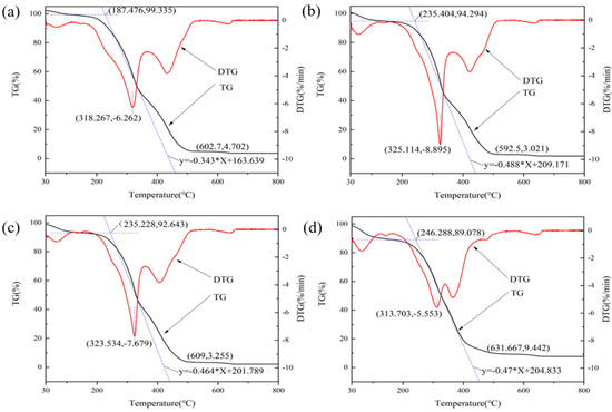 The thermogravimetric data from Ta to Tpeak were analyzed using the Coats-Redfern method (Figure 4b). The Coats-Redfern model usually provides more information regarding the composition variation during pyrolysis than the FWO model. The activation energy determined using the Coats-Redfern model was much lower than that derived from the FWO model. The activation energies determined by the FWO model were 199–335 kJ/mol, whereas those determined by Coats-Redfern were 51–69 kJ/mol. This is because the FWO model includes the activation energies for both the decomposition reaction and diffusion during pyrolysis, while the Coats-Redfern model only considers the decomposition reaction during pyrolysis. However, both models showed the same overall pattern.