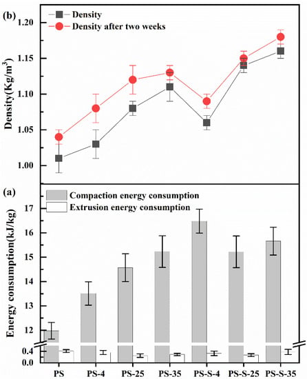 (a) Energy consumption for pelletization, (b) single pellet density of PS, PS-4, PS-25, PS-35, PS-S-4, PS-S-25, and PS-S-35.