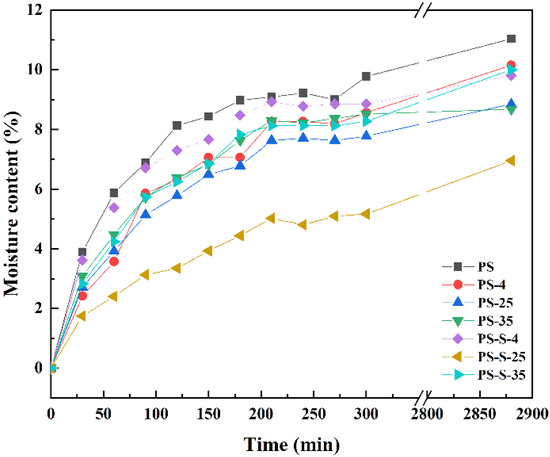 Moisture absorption of PS, PS-4, PS-25, PS-35, PS-S-4, PS-S-25, and PS-S-35 samples.