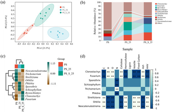 Fungi community analyzes conducted during PS, PS-25, PS-S-25 groups. (a) PCoA of the fungi communities in the compost based on DADA2, (b) Fungi level composition of the fungi community, (c) Heat map of species composition, (d) Corheatmap. ** There is a correlation, white is positive, dark blue is negative.