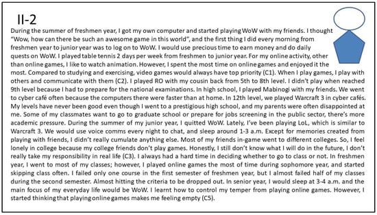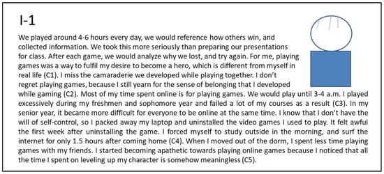Figure 1 shows the interview summary of the narrative about the first persona, I-1 (Internet addiction; non-depression, see Table 2). He showed a high involvement in gaming and a high level in all three motives (advancement, socializing, and escapism). He preferred to play the most popular MMORPG game and DotA real-time strategy game. I-1 is passionate about pursuing achievements (pull effect, advancement) in the game, enjoys being with other gamers, and easily becomes teammates with them (pull effect, socializing). He has good social ability and likes to play games with other boys side by side (pull effect, socializing). Due to his focus on online games, his academic achievement fell from his freshman to junior years (push effect, escapism). Across three years, he spent a lot of time playing games with roommates living in the same dorm (mooring in the virtual world). After his junior year, he moved out from the college dormitory and could not play games closely with his peers.