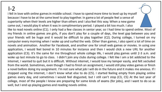 Figure 2 shows the interview summary of the narrative about the second persona, I-2 (Internet addiction; non-depression, see Table 2) who was selected because her persona was significantly different from the first persona. From her freshman to her senior year, I-2 focused on gaming. She pursued advancement in gaming (pull effect for advancement). To play games with her partners (pull effect for socializing), she spends a lot of time practicing game skills and earning points (pull effect for advancement) to keep up with the in-game levels for friends (pull effect for socializing). In real life, she cannot find the focus for life and has few friends (push effect for socializing). Although she can handle college studies roughly, she feels very mixed-up about life (push effect for escapism). I-2 does not join any student club and works part-time very briefly during college (push effect for escapism). In addition to playing games, I-2 also spends a lot of time reading online novels and animations (mooring in the virtual world). She feels a sense of emptiness about spending a long time online, but she cannot cope without the Internet.