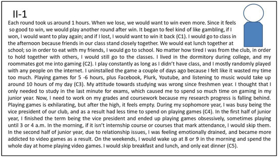 Figure 3 shows the interview summary of the narrative about the third persona, II-1 (Internet addiction; depression, see Table 2) who started playing online games in freshman year with roommates (pull effect for socializing). He was immersed in the feeling of victory in gaming (pull effect for advancement). When he had important personal tasks (such as attending a student club) it was easy for him to leave the virtual world. When he unloaded his responsibilities in real life, he would be immersed in gaming (push effect, escapism). He refused to take the responsibility for his studies and often skipped classes. In his junior year, II-1 felt depressed because of the problems in an intimate relationship (push effect, escapism). Afterwards, he then fell into gaming almost all day (mooring in the virtual world), and his studies failed. In his senior year, II-1 started feeling worried about his future, so he began to study hard and cut off gaming. He deliberately found a job to keep himself busy and reduced the chances of being overly immersed in gaming. However, he admits that he still spent as much time as he could in games.