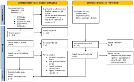 The literature search yielded 559 articles published between 1 January 2000 and 15 October 2022. Additionally, citation search of qualified papers resulted in extraction of 259 studies making it a total of 818 studies. After removing 142 duplicates, the final number of studies was 676 studies. After screening the title and abstracts, 33 studies qualified for full—text assessment. None of the citation search papers qualified for the full-text assessment. The entire PRISMA diagram of the study search can be found in Figure 1. Both the researchers independently reviewed the full—texts of the 33 articles (Figure 1). From the full—text screening, 10 articles [28,45,59,60,61,62,63,64,65,66] (references [28,45,59,60,61,62,63,64,65,66] are cited in the Supplementary materials) qualified for quantitative meta—analysis. Of the 10 studies, 2 studies [64,66] calculated the prevalence of either depression or anxiety, or prevalence of depression and anxiety together, 5 studies focused only on depression [28,45,59,61,65], 2 studies focused only on anxiety [60,63] and 1 study focused on depression and anxiety separately [62]. With respect to region, 3 articles [59,62,64] reported prevalence of depression and anxiety in rural area, 1 study [61] in urban area, and 6 articles [28,45,60,63,65,66] reported prevalence of depression and anxiety in both urban and rural areas. This resulted in 17 estimates for calculating pooled prevalence in the meta-analysis.
