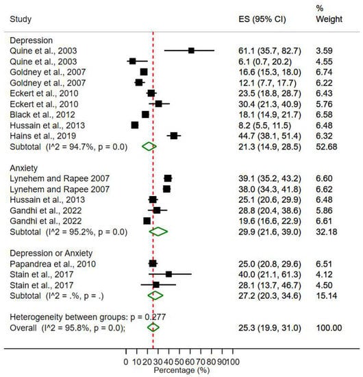 Figure 2. Meta-analysis and pooled estimate of depression, anxiety and both disorders [14,28,45,59,60,61,62,63,65,66].