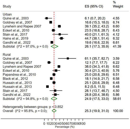 The pooled prevalence of depression and anxiety for urban areas was 21.2% (95% CI, 13.0–30.7%). The pooled prevalence for depression and anxiety in rural areas was 24.6% (95% CI, 17.0–33.2%). High heterogeneity between studies is evident for both rural subgroup (I2 = 95.4%, p < 0.001), urban subgroup (I2 = 97.0%, p < 0.001) and all studies together (I2 = 96.0%, p < 0.001). However, heterogeneity between the rural subgroup and urban subgroup is not statistically significant (p = 0.56). (Supplementary Materials: Figure S10)