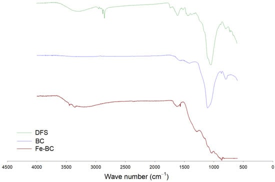 FTIR analysis of date palm waste (DFS), date palm waste biochar (BC), and Fe-modified biochar (Fe-BC).
