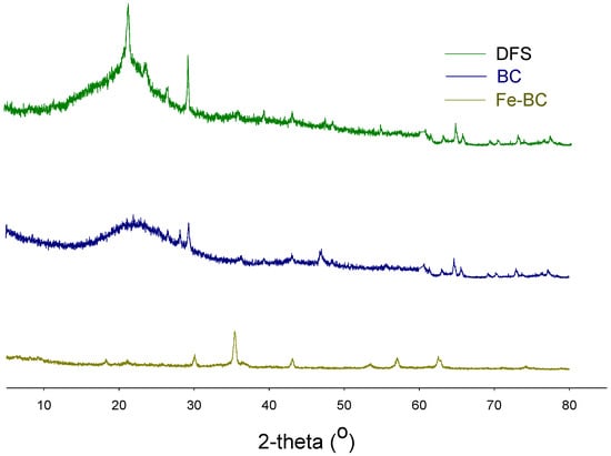 X-ray diffraction analysis of date palm waste (DFS), date palm waste biochar (BC), and Fe-modified biochar (Fe-BC).