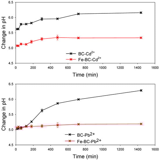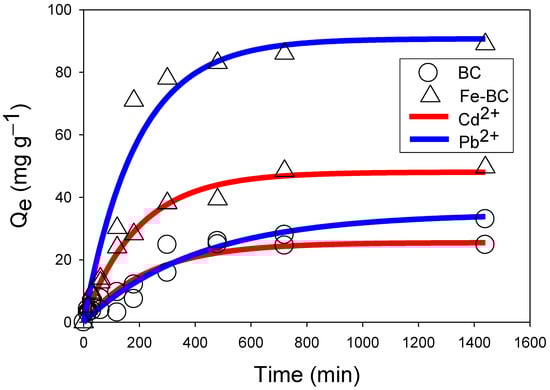 The performance of the produced BC and Fe-modified BC to adsorb Cd2+ or Pb2+ from contaminated water was assessed in batch-type adsorption experiments. The effect of contact time on the adsorption of Cd2+ or Pb2+ onto the adsorbents is shown in Figure 3. The adsorption of Cd2+ or Pb2+ followed three phases, i.e., rapid, relatively slower, and equilibrium. A relatively quicker adsorption for both of the metals was seen during the first 200 min due to the accessibility of plentiful adsorption sites, followed by a relatively slow adsorption and eventually equilibrium stage. Overall, the adsorption of Pb2+ was higher than Cd2+ onto both of the adsorbents. This is because Pb2+ contains a negative logarithm of hydrolysis constant (7.71), which is less than that of Cd2+ (10.1) and helps Pb2+ to be adsorbed easily via surface complexation [31]. The Fe-BC exhibited a higher adsorption capacity compared with the pristine BC.