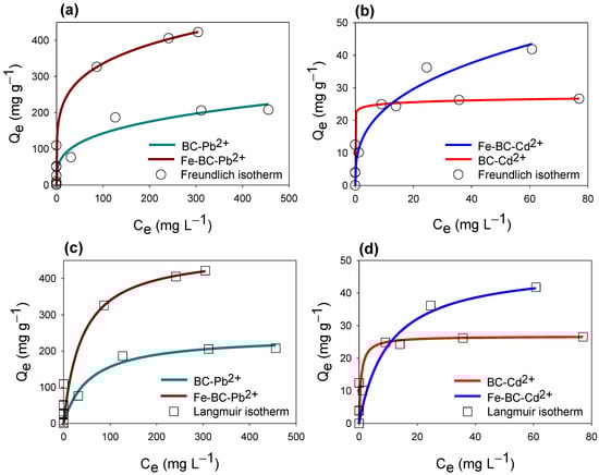 Isotherm curves for Freundlich (a,b) and Langmuir (c,d) models’ fittings for cadmium (Cd2+) and lead (Pb2+) adsorption on date palm waste biochar (BC) and Fe-modified biochar (Fe-BC).