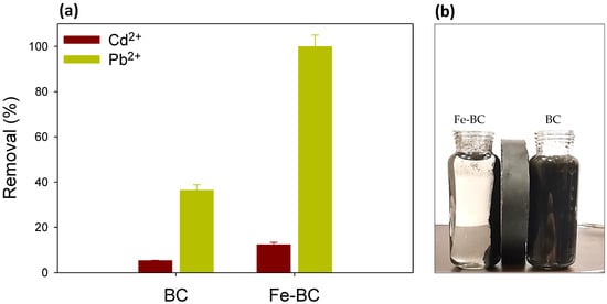 (a) Competitive removal of cadmium (Cd2+) and lead (Pb2+) ions from binary solution on date palm waste biochar (BC) and Fe-modified biochar (Fe-BC), (b) attraction of BC and Fe-BC materials to the applied magnetic force.