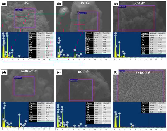 SEM–EDS analyses for (a) date palm waste biochar (BC), (b) Fe-modified biochar (Fe-BC) before the adsorption, and after the (c) adsorption of cadmium (Cd2+) onto BC, (d) adsorption of Cd2+ onto Fe-BC, (e) adsorption of lead (Pb2+) onto BC, and (f) adsorption of Pb2+ onto Fe-BC.
