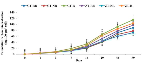 Cumulative carbon mineralization (mg 100 g−1 soil) of bulk soil in 0–5 cm depths as affected by 18 years of tillage and residue management in a rice–wheat cropping system in an Inceptisol at 27 °C. ZT = zero tillage; CT = conventional tillage; NR = no residue; RB = residue burning; R = residue retention. Error bars identify LSD (p ≤ 0.05) of different treatments.