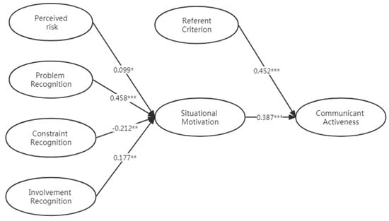 (5) In PHE, there is a significant positive relationship between health information, situational motivation for outdoor activities, and communicant activeness. The motivation theory holds that motivation represents the initiative of individuals to take action [34]. Situational motivation is a mediator variable generated by the three antecedents of perceived risk, problem recognition, and involvement recognition. The higher the residents’ awareness of health issues, involvement recognition, and perceived risk, the stronger the situational motivation, and the greater the possibility of adopting communicant activeness, which is consistent with the research result of Kim [19];