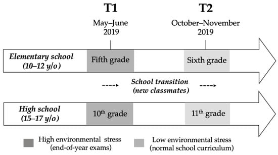 Schematic representation of the original study design conducted by A-A. Journault et al. Elementary school students were followed from Grade 5 (T1) to Grade 6 (T2) and high school students were followed from Grade 10 (T1) to Grade 11 (T2). For both elementary and high school students, T1 occurred at the end of the school year (May and June 2019), which was characterized as a high environmental stress period. T2 occurred at the beginning of the next school year (October and November 2019), during the normal school curriculum, which was characterized as a period of low environmental stress.